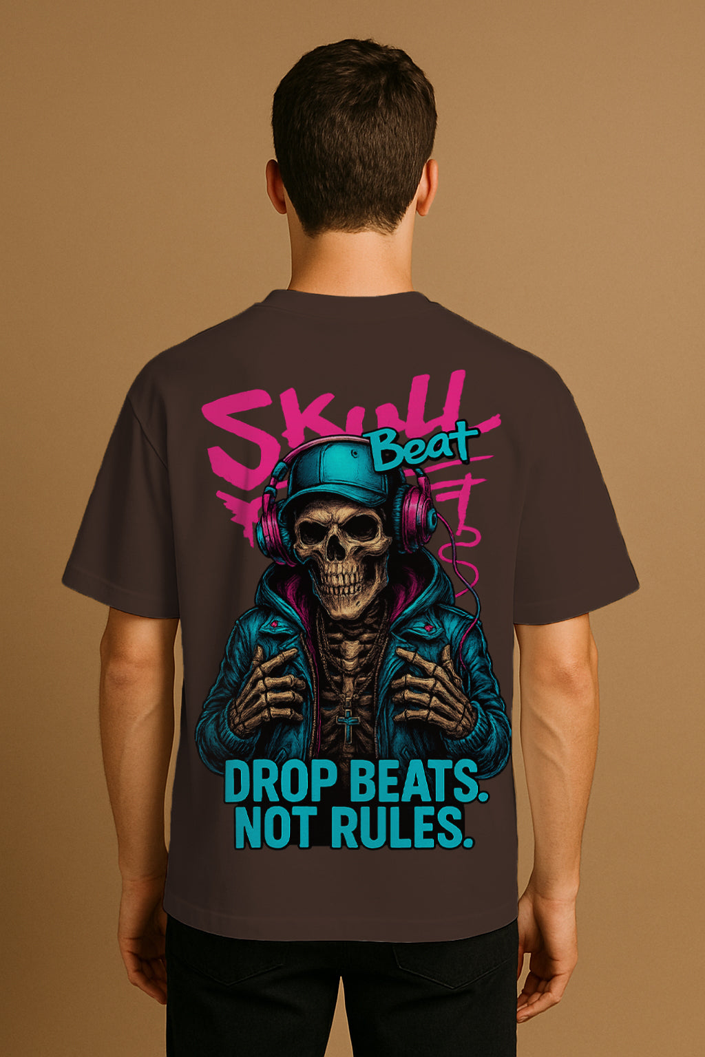 On the back, Skull Beat looks straight at the world as neon letters shout his motto: DROP BEATS. NOT RULES. On the front, a clean headphones–skull crest keeps the legend subtle. When friends ask why you chose it, tell them: “Because I don’t just play songs—I play possibilities.”