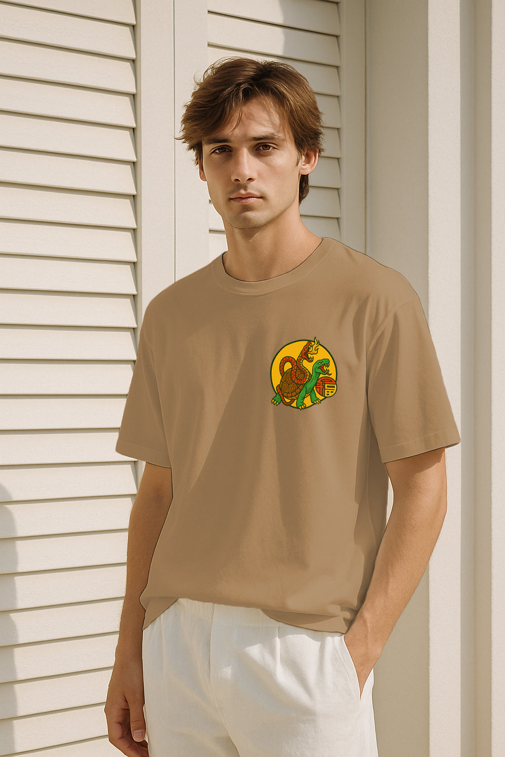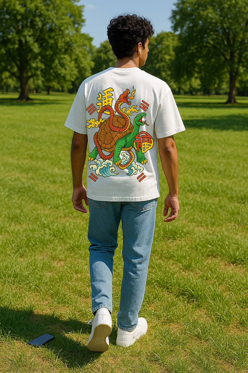 On the back, the Dragon Turtle charges through rolling water with symbols of blessing—the kind you earn with bold steps and steady focus. On the front, a clean chest emblem keeps the legend close to your heart. When your friends ask why you chose it, tell them: “It’s a guardian for risk-takers—the more I move forward, the more fortune follows.”