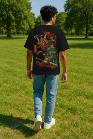 Flame Samurai Oversized Graphic T-Shirt – 240 GSM Terry Cotton (Japanese Back Print)