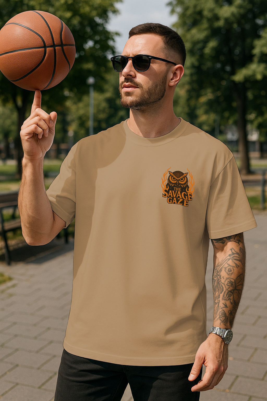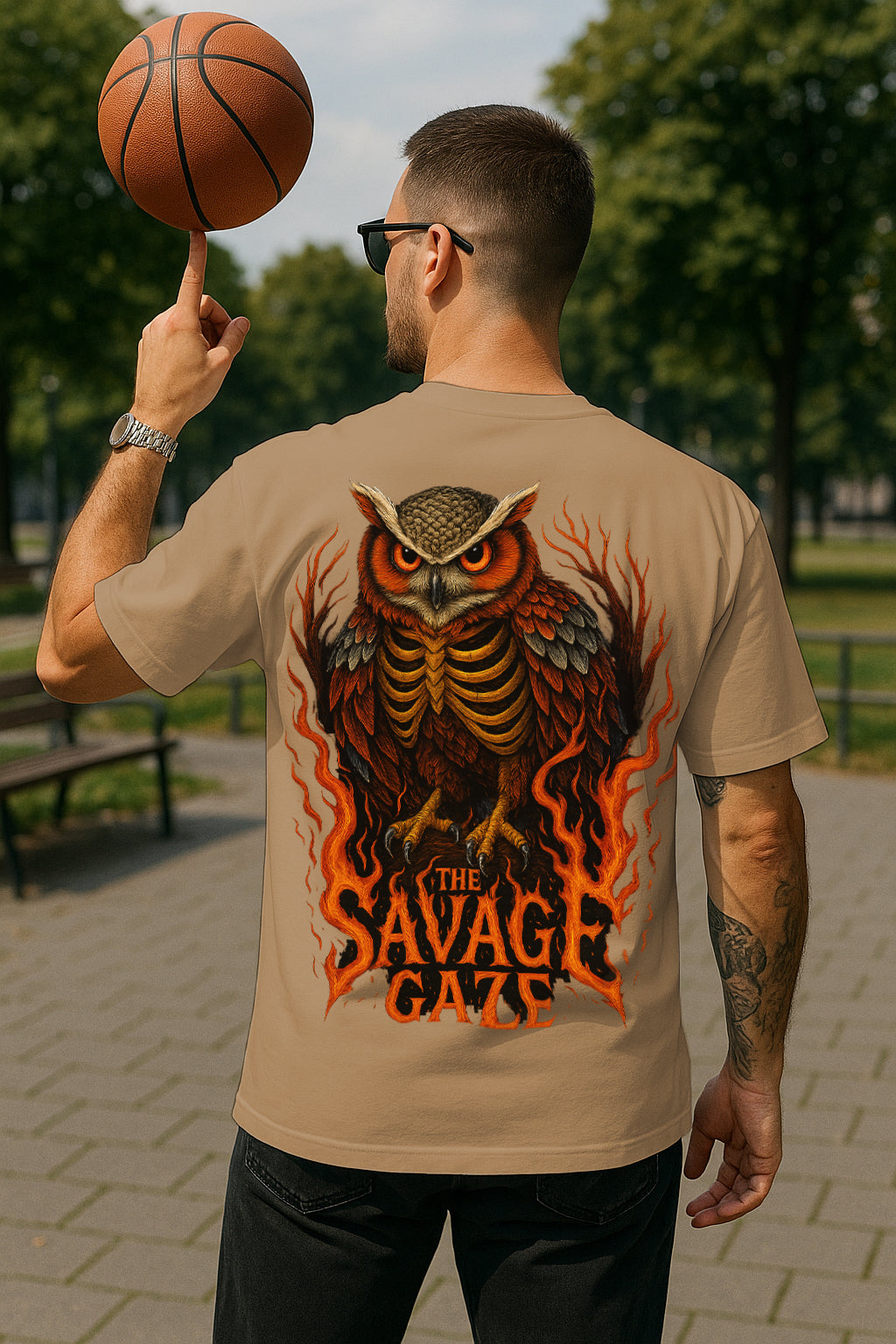 In every city there’s a watcher. When the streets go quiet and the lamps burn low, the Savage Gaze opens—two blazing eyes cutting through smoke and rumor. The old hoop on the corner squeaks once and falls silent; the owl lands above it like a judge. People say if you meet that stare, excuses melt and your next move chooses you. This tee captures that midnight legend: feathers like fire, talons ready, and a motto you can feel without reading—see clearly, strike cleanly.