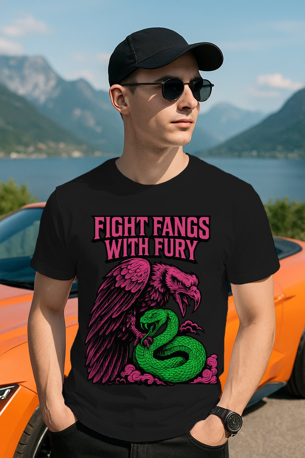 At the edge of a canyon town, a muralist painted a legend: when storms rolled in, an eagle would dive from the cliffs and a serpent would rise from the river—two forces meeting in a flash of thunder. One didn’t destroy the other; they tested each other’s strength until the sky cleared. Locals say if you stood under that mural on a tough day, the wind felt different—like it was telling you, meet your challenges head-on—fight the fangs with fury. This tee captures that moment: wings flared, coils ready, courage frozen in ink.