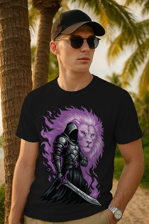 When the coast was still and the moon was thin, a nameless knight walked the shoreline with a blade that never boasted. In the hush, a leonine spirit rose from the night air—mane like flame, eyes steady as dawn. “I lend my roar to your silence,” it said. The knight bowed, and together they guarded travelers who’d lost their way. This tee captures that pact—steel and shadow backed by a calm, relentless lion—so when friends ask why you chose it, you’ll say: because real strength speaks softly, but is never ignored.