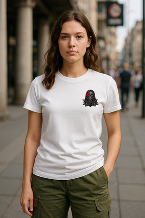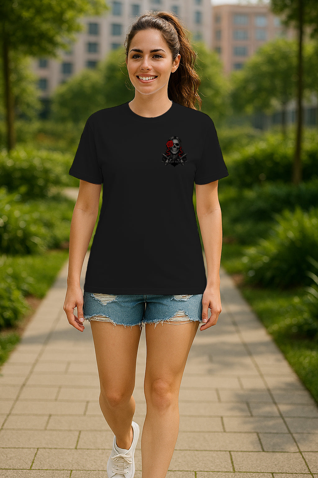 Women who love gothic streetwear, tattoo art, biker-punk vibes, and conversation-starter tees. Ideal for concerts, weekend rides, gifting, and bold everyday outfits.