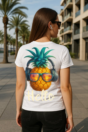 • Statement Artwork: Tropical pineapple with headphones and sunglasses plus the cheerful “Hello” script.
