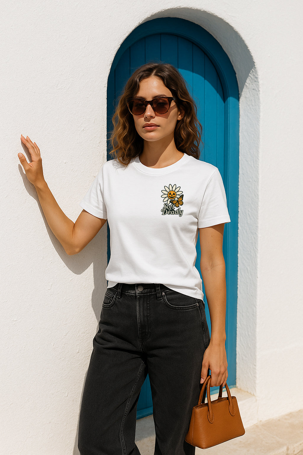 In the quiet town of Moonridge, a shy artist named Lila painted a tiny daisy on the corner of every gray wall she passed. One evening, a butterfly landed on her brush and the daisy winked back with a mischievous smile—sweet, but undeniably fierce. People started spotting the daisy everywhere—bus stops, coffee cups, guitar cases—always guarded by fluttering monarchs. They called it the Soft But Deadly bloom: gentle in spirit, powerful in presence.