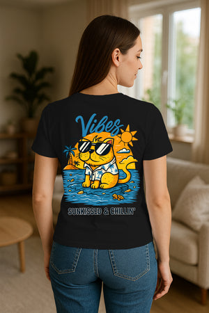 Vibes Sunkissed & Chillin’ Cat Graphic T-Shirt for Women – Beach Summer Streetwear Tee