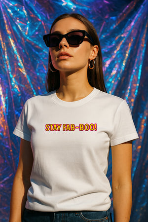 Every October, a tiny ghost drifts out of a neon-lit alley with a swaggy cap, chunky dollar chain, and shades brighter than the moon. She calls herself “Fab-Boo”—the hype-ghost who turns shy vibes into spotlight moments. Legend says anyone who wears her message, “STAY FAB-BOO!”, gets a playful boost of confidence: suddenly you’re the friend with the best comebacks, the boldest dance moves, and the loudest laugh in every group photo. This tee celebrates that spirit—cute, quirky, and a little bit legendary. When someone asks why you chose this design, tell them you met the ghost who makes confidence contagious.